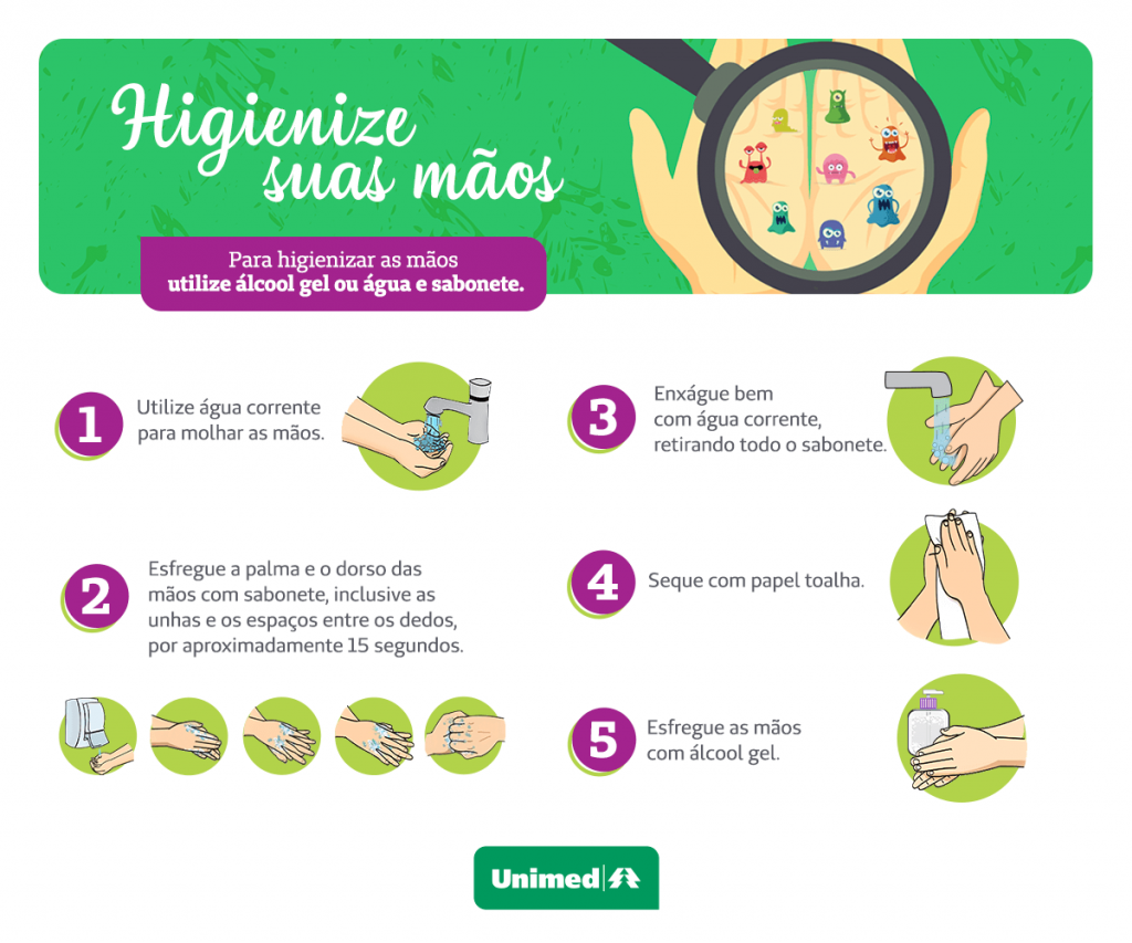 Para um aboa higiene, utilize álcool gel ou água e sabonete. 1 – Utilize água corrente para molhar as mãos; 2 – Esfregue a palma e o dorso das mãos com sabonete, inclusive as unhas e os espaços entre os dedos, por aproximadamente 15 segundos; 3 – Enxágue bem com água corrente, retirando todo o sabonete; 4 – Seque com papel toalha; 5 – Esfregue as mãos com álcool gel.