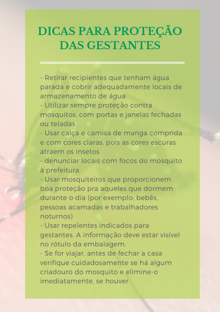 Gestante, sempre que perceber qualquer alteração durante a gestação, informe sua equipe de saúde da família ou de atenção integral à saúde. É importante reforçar que, em qualquer situação, as gestantes precisam consultar seu médico antes de viajar e que é necessário um cuidado especial nestas ocasiões. Medidas de prevenção pessoal para gestantes e mulheres em idade fértil com possibilidade de engravidar: