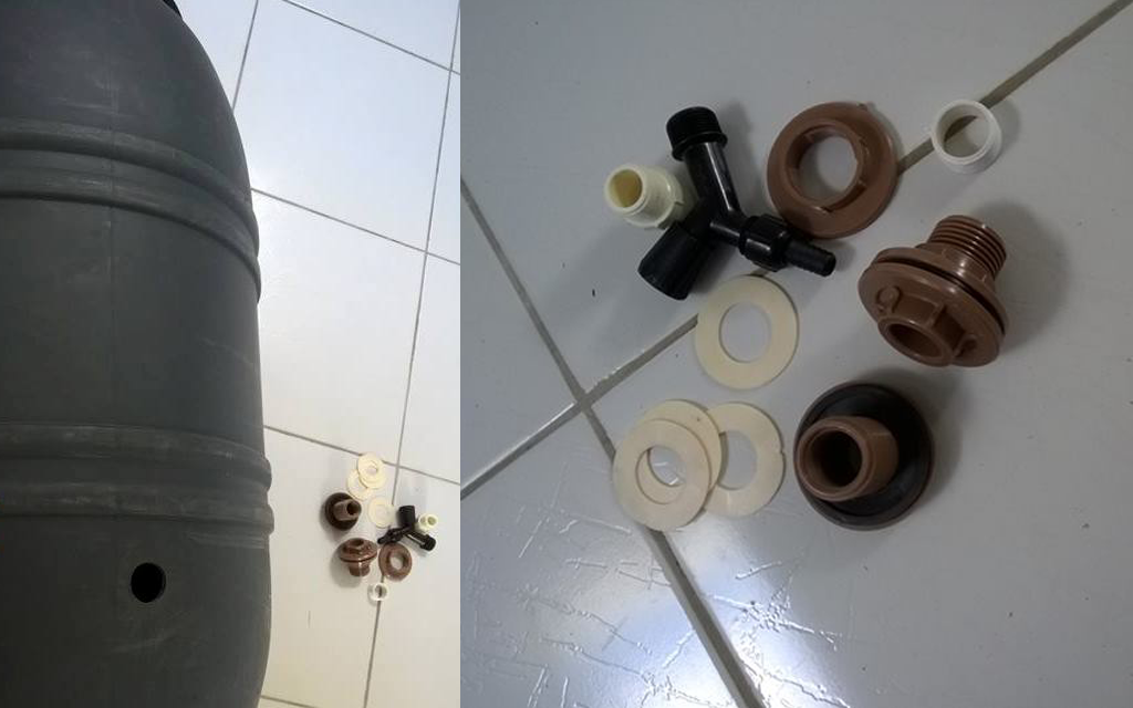 Passo 2 Comprar flanges para a caixa d’água, quatro borrachas de vedação finas, ou duas de maior espessura compatíveis com o flange, uma torneira, uma rosca (deve ser do mesmo tamanho do buraco – recomenda-se ¾) e fita veda rosca.