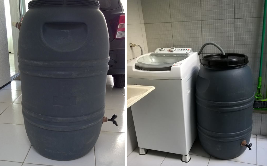 Quer saber como reaproveitar a água da máquina de lavar roupa? Confira a seguir a proposta da estudante de arquitetura de Fortaleza, no Ceará, Lanna Ribeiro. Ela desenvolveu um sistema simples para reutilizar a água da máquina de lavar para usos como lavagem de áreas e carros. Siga este exemplo: Passo 1 Comprar um reservatório onde a água será armazenada. Ele precisa ter um furo na tampa, onde a água da máquina irá entrar, um na parte inferior, onde sairá para utilização e um furo na parte superior.