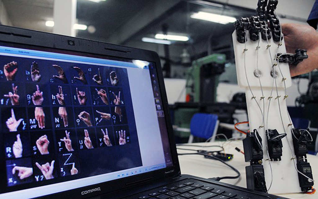 Mas, e quem não conhece Libras, como se comunica? Pensando em uma forma de ajudar a comunicação entre surdos e ouvintes que não conhecem a linguagem, alguns aplicativos foram criados no Brasil e vêm ganhando mais adeptos a cada dia, seja nos celulares, smartphones ou mesmo em diversos sites. O ProDeaf é um conjunto de softwares capazes de traduzir texto e voz de português para Libras, com o objetivo de permitir a comunicação entre surdos e ouvintes. As soluções foram desenvolvidas para que as empresas possam promover acessibilidade e inclusão social a seus clientes e colaboradores. Já a Hand Talk realiza tradução digital e automática para Língua de Sinais, utilizada pela comunidade surda. A solução oferece ferramentas complementares ao trabalho do intérprete para auxiliar a comunicação entre surdos e ouvintes. Ela é comandada por um simpático intérprete virtual, o Hugo, personagem 3D que torna a comunicação interativa e de fácil compreensão. Baixe e experimente! Iniciativa inovadora Pensando numa forma de ajudar os deficientes auditivos, os pesquisadores Miguel Félix Mata e Helena Luna García, do Instituto Politécnico Nacional (IPN), no México, desenvolveram um protótipo que, através de um aplicativo, transforma os movimentos feitos na linguagem de sinais em texto e sons. O aplicativo é, na verdade, uma luva que detecta os movimentos realizados pelo usuário com a mão e os associa com as 26 letras do alfabeto. “São formadas palavras e frases transmitidas a um dispositivo com o aplicativo pré-carregado, que mostra e lê os sinais das pessoas que usam a luva e querem transmitir uma mensagem”, explicou Luna García à Agência Efe.