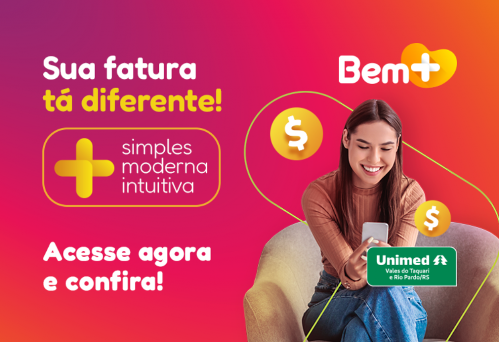 A sua fatura está disponível também no Bem+ Unimed. No Bem+ você pode consultar senhas, resultados de exames, receitas e atestados e gerar o cartão virtual do plano.
