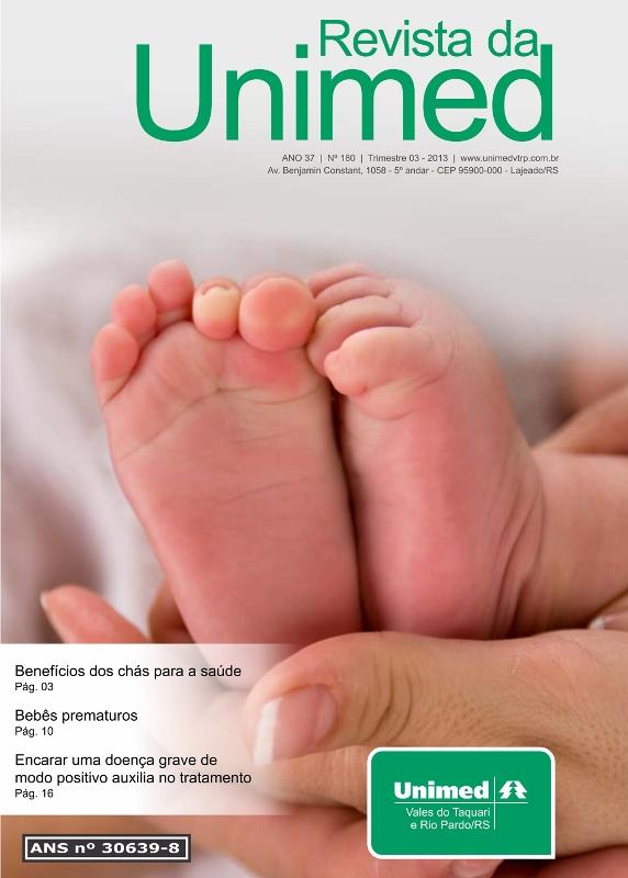 Interessados em assuntos de saúde já podem conferir a última edição da Revista da Unimed, uma publicação trimestral da Unimed Vales do Taquari e Rio Pardo (Unimed VTRP). Na capa, uma foto de pezinhos de bebê faz referência à matéria das páginas centrais, sobre o nascimento de prematuros e seu desenvolvimento. Entre outros temas, os benefícios dos chás, a volta da coqueluche e os riscos da Doença da Pressa. A maioria dos textos tem como fonte médicos e profissionais de saúde da região.