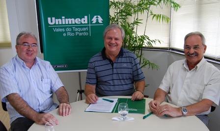 Presidentes da Unimed VTRP, Dr. Rech, e do Santa Cruz, Leo Schwingel; com o diretor de Marketing da Cooperativa, Dr. Jucá
